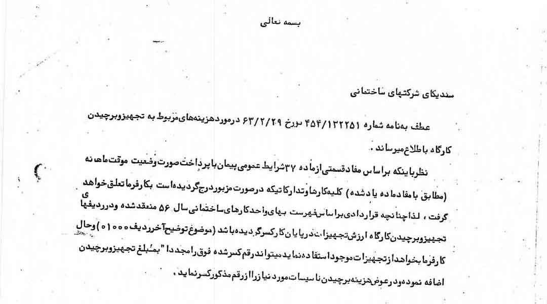 عطف به نامه ۱۲۲۲۵۱-۴۵۴مورخ ۲۹-۰۲-۱۳۶۳درمورد هزینه های مربوط به تجهیزوبرچیدن کارگاه به اطلاع میرساند :
