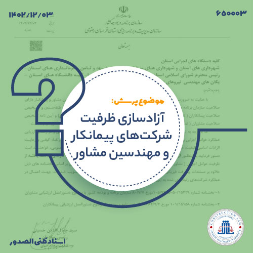 با احترام بازگشت به نامه شماره 2336-6-6-240-س مورخ 15-08-1384به آگاهی میرساند مطابق ماده ۳۷ شرایط عمومی پیمان پیمانکار متعهد است در آخر هر ماه صورت وضعیت کارهای انجام شده را از شروع کار تا تاریخ مذکور طبق نقشههای اجرایی دستور کارها و صورت مجالس با احتساب مقدار مصالح و تجهیزات پای کار تهیه و تسلیم دستگاه نظارت نماید. بنابراین چنانچه صورت وضعیتی که توسط پیمانکار تنظیم و ارسال شده فاقد هر یک از موارد ذکر شده در بالا باشد و یا اشتباهی در صورت وضعیت مزبور مشاهده شود ناقص تلقی و در این صورت برای تکمیل موارد نقص و یا کمبود مدارک و رفع اشتباهات مندرج در آن به پیمانکار عودت داده میشود یا موارد یاد شده توسط دستگاه نظارت حسب مورد از صورت وضعیت موصوف حذف و یا اصلاح گردیده و برای کارفرما ارسال میشود مهلت پرداخت صورت وضعیت از تاریخی شروع میشود که صورت وضعیت تکمیل و اصلاح شده از جانب پیمانکار به دستگاه نظارت تسلیم گردد.