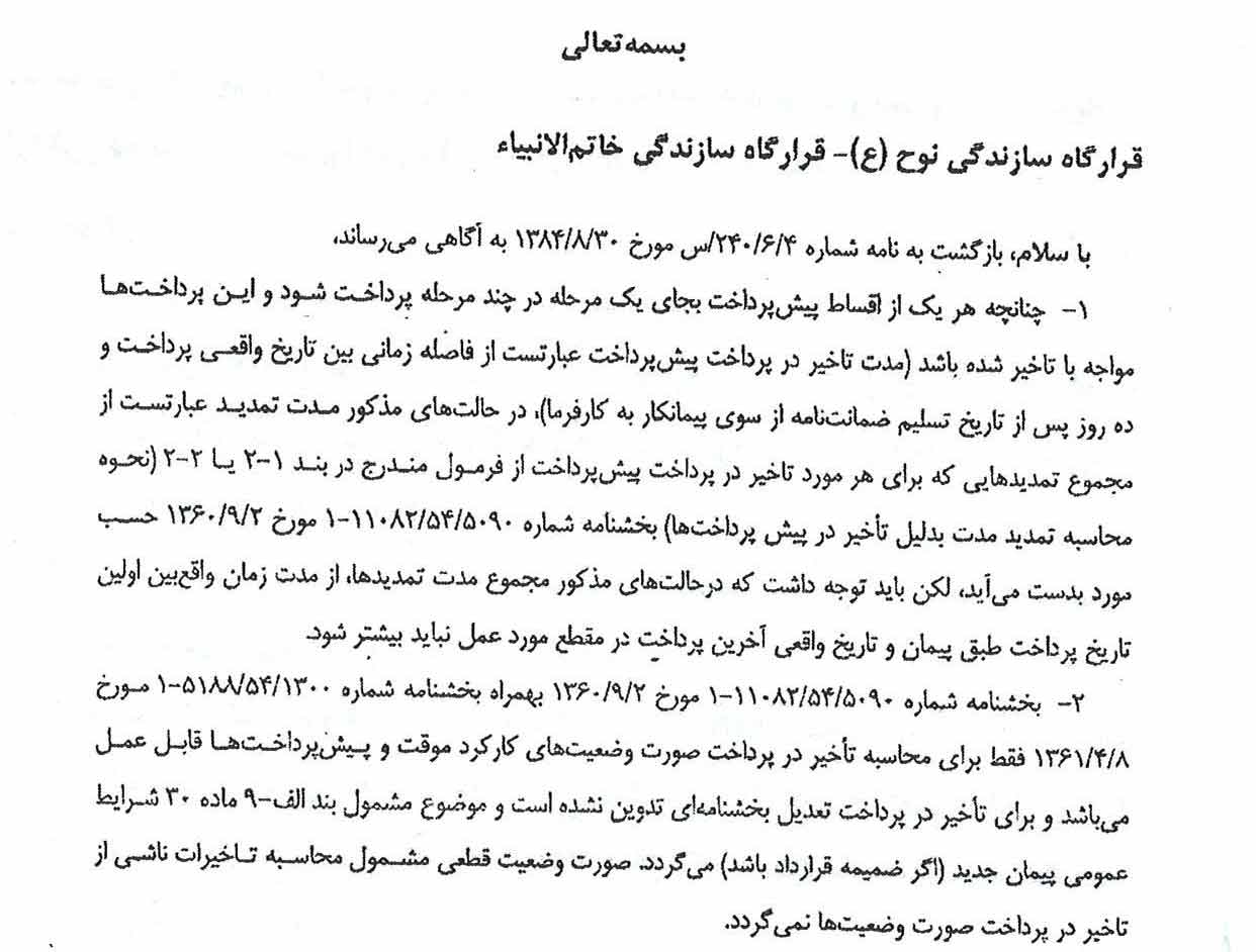 ١. چنانچه هر یک از اقساط پیش پرداخت به جای یک مرحله در چند مرحله پرداخت شود و این پرداخت ها مواجه با تأخیر شده باشد (مدت تأخیر در پرداخت پیش پرداخت عبارتست از فاصله زمانی بین تاریخ واقعی پرداخت و ده روز پس از تاریخ تسليم ضمانت نامه از سوی پیمانکار به کارفرما)، در حالت های مذکور مدت تمدید عبارتست از مجموع تمديد هایی که برای هر مورد تأخیر در پرداخت پیش پرداخت از فرمول مندرج در بند ۱-۲ یا ۲-۲ (نحوه محاسبه تمدید مدت به دلیل تأخیر در پیش پرداختها) بخشنامه شماره 5090-54-11082-1مورخ 02-09-1360حسب مورد به دست می آید، لكن باید توجه داشت که در حالت های مذکور مجموع مدت تمديدها، از مدت زمان واقع بین اولین تاریخ پرداخت طبق پیمان و تاریخ واقعی آخرین پرداخت در مقطع مورد عمل نباید بیشتر شود.