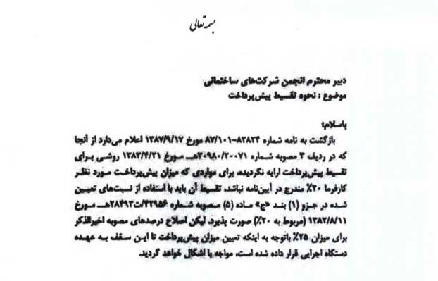 برگشت به نامه شماره 82834-101-87 مورخ 17-09-1387 اعلام میدارد از آنجا که در ردیف 3 مصوبه شماره 20071-20980 ه مورخ 21-02-1383 روشی برای تقسیط پیش پرداخت ارائه نگردیده، برای مواردی که میزان پیشپرداخت مورد نظر کارفرما ۲۰% مندرج در آیین نامه نباشد، تقسیط آن باید با استفاده از نسبت های تعیین شده در جزو (1) بند «ح» ماده (5) مصوبه شماره 22956-ت28492 ه مورخ 11-08-1382 (مربوط به 20%) صورت پذیرد، لیکن اصلاح درصدهای مصوبه اخیرالذکر برای میزان 25% باتوجه به اینکه تعیین میزان پیشپرداخت تا این سقف به عهده دستگاه اجرایی قرار داده شده است، مواجه با اشکال خواهد گردید.