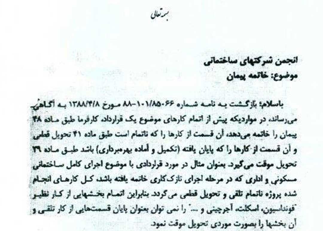 باسلام؛ بازگشت به نامه شماره ۸۵۰۶۶-۱۰۱-۸۸ مورخ ۰۸-۰۴-۱۳۸۸ به آگاهی میرساند. در مواردی که پیش از اتمام کارهای موضوع یک قرارداد، کارفرما طبق ماده ۴۸ پیمان را خاتمه میدهد. آن قسمت از کارها را که ناتمام است طبق ماده ۲۱ تحویل قطعی و آن قسمت از کارها را که پایان یافته (تکمیل و آماده بهرهبرداری) باشد طبق ماده ۲۹ تحویل موقت میگیرد. بعنوان مثال در مورد قراردادی با موضوع اجرای کامل ساختمانی مسکونی و اداری که در مرحله اجرای تازک کاری خاتمه یافته باشد، کل کارهای انجام شده پروژه ناتمام تلقی و تحویل قطعی میگردد. بنابراین اتمام بخشهایی از کار نظیر فونداسیون، اسکلت، آجرچینی و … را نمی توان بعنوان پایان قسمت هایی از کار تلقی و آن بخشها را بصورت موردی تحویل موقت نمود.
