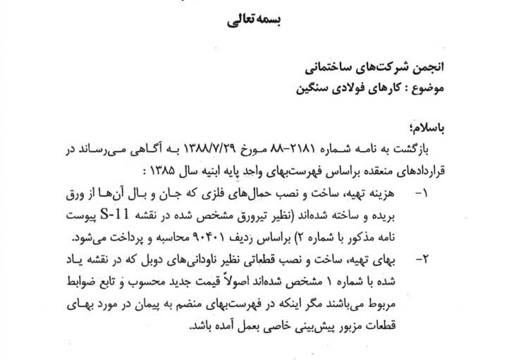 بازگشت به نامه شماره ۲۱۸۱-۸۸ مورخ ۱۳۸۸/07/۲۹ به آگاهی میرساند در قراردادهای منعقده براساس فهرست بهای واحد پايه ابنیه سال ۱۳۸۵:
