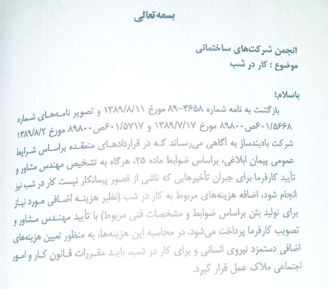 بازگشت به نامه شماره 4685-89 مورخ 11-08-1389 و تصویر نامههای شماره 5668-601ص89800 مورخ 17-07-1389 و 5717-601ص 89800 مورخ 02-08-1389 شرکت بادبندساز به آگاهی میرساند که در قراردادهای منعقده براساس شرایط عمومی پیمان ابلاغی، براساس ضوابط ماده ۲۵، هرگاه به تشخیص مهندس مشاور و تأييد كارفرما برای جبران تأخیرهایی که ناشی از قصور پیمانکار نیست کار در شب نیز انجام شود، اضافه هزینههای مربوط به کار در شب (نظیر هزینه اضافی مورد نیاز برای تولید بتن براساس ضوابط و مشخصات فنی مربوط) با تأیید مهندس مشاور و تصویب کارفرما پرداخت میشود. در محاسبه این هزینهها، به منظور تعیین هزینههای اضافی دستمزد نیروی انسانی و برای کار در شب، باید مقررات قانون کار و امور اجتماعی ملاک عمل قرار گیرد.