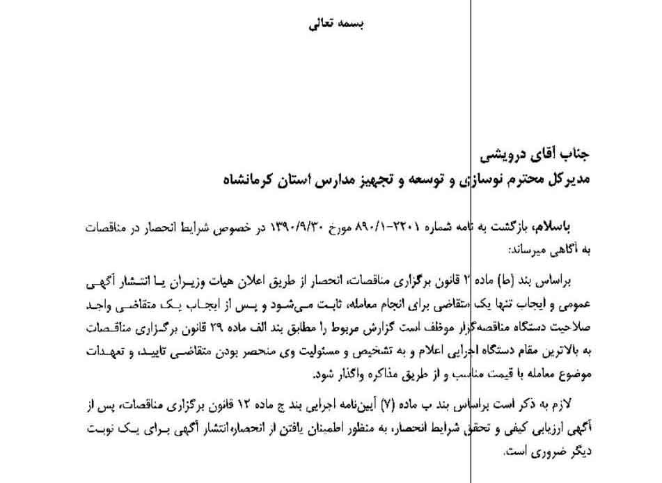 باسلام، بازگشت به نامه شماره ۲۲۰۱-۱-۸۹۰ مورخ ۳۰-09-۱۳۹۰ در خصوص شرایط انحصار در مناقصات به آگاهی میرساند: