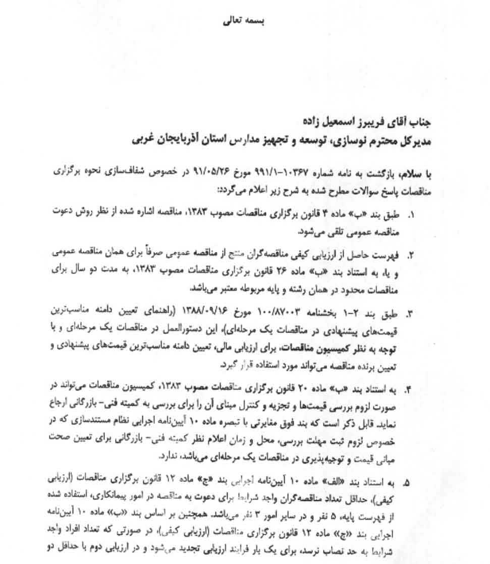 باسلام، بازگشت به نامه شماره ۱۰۳۶۷-۱-۹۹ مورخ ۲۶-۰۵-1391 در خصوص شفاف سازی نحوه برگزاری مناقصات پاسخ سوالات مطرح شده به شرح زیر اعلام میگردد: