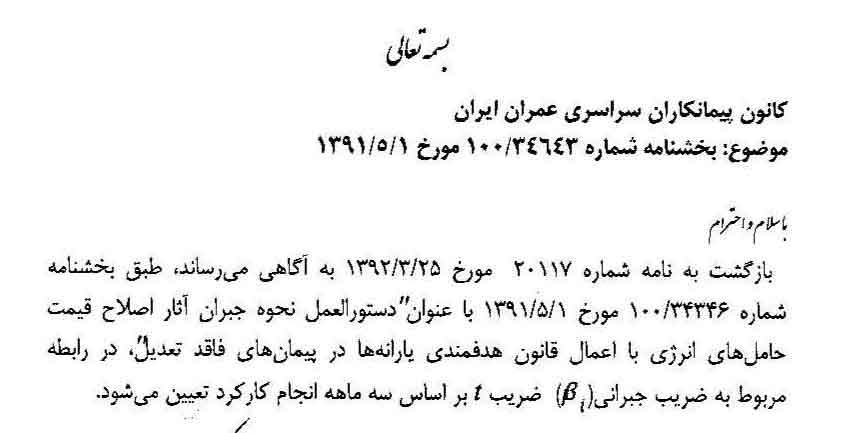 بازگشت به نامه شماره ۲۰۱۱۷ مورخ ۲۵-03-۱۳۹۲ به آگاهی میرساند، طبق بخشنامه شماره ۳۴۳۴۶-۱۰۰ مورخ ۱-۵-۱۳۹۱ با عنوان “دستورالعمل نحوه جبران آثار اصلاح قیمت حاملهای انرژی با اعمال قانون هدفمندی یارانهها در پیمانهای فاقد تعدیل”، در رابطه مربوط به ضریب جبرانی(B۱) ضریب t بر اساس سه ماهه انجام کارکرد تعیین میشود.