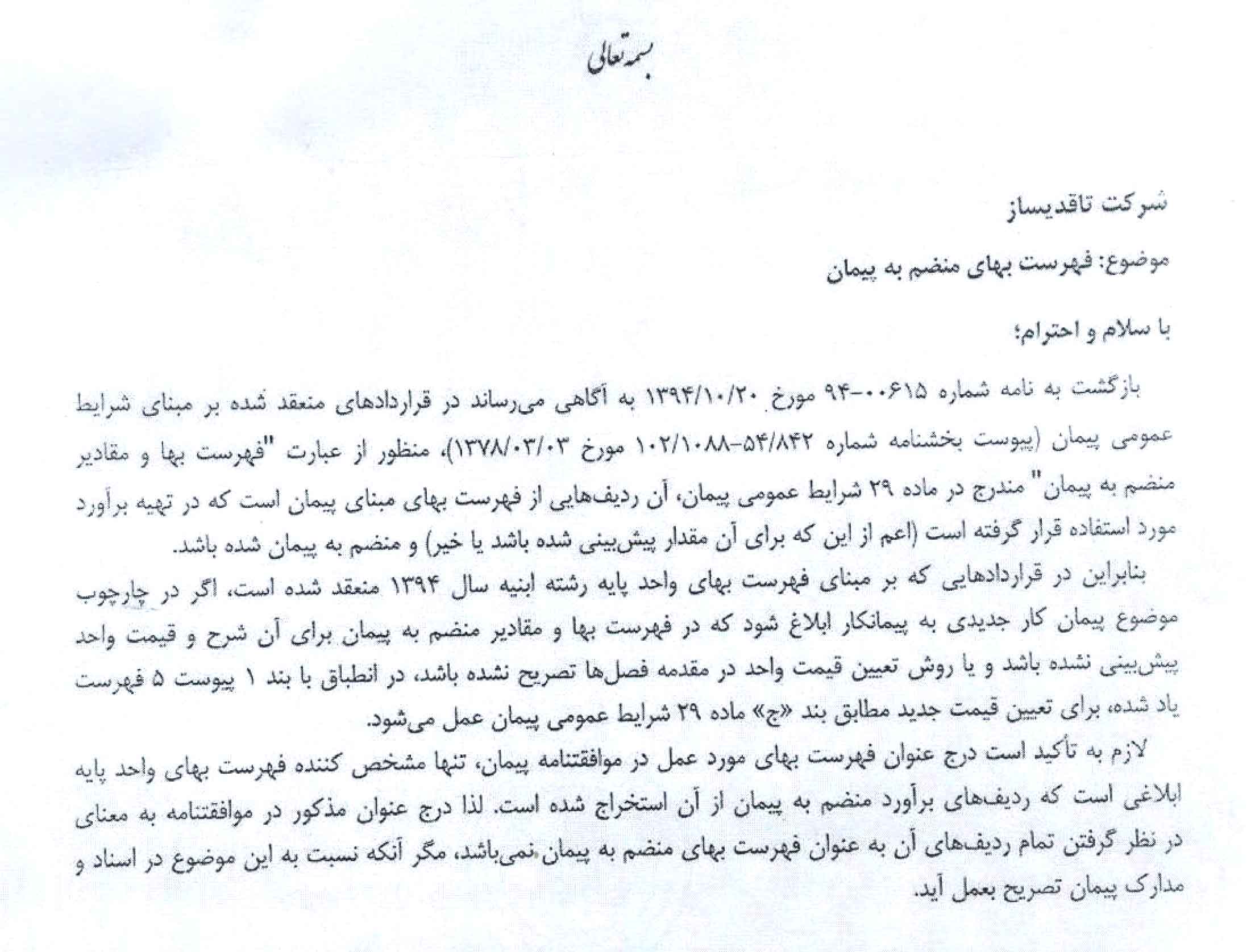 موضوع: فهرست بهای منضم به پیمان