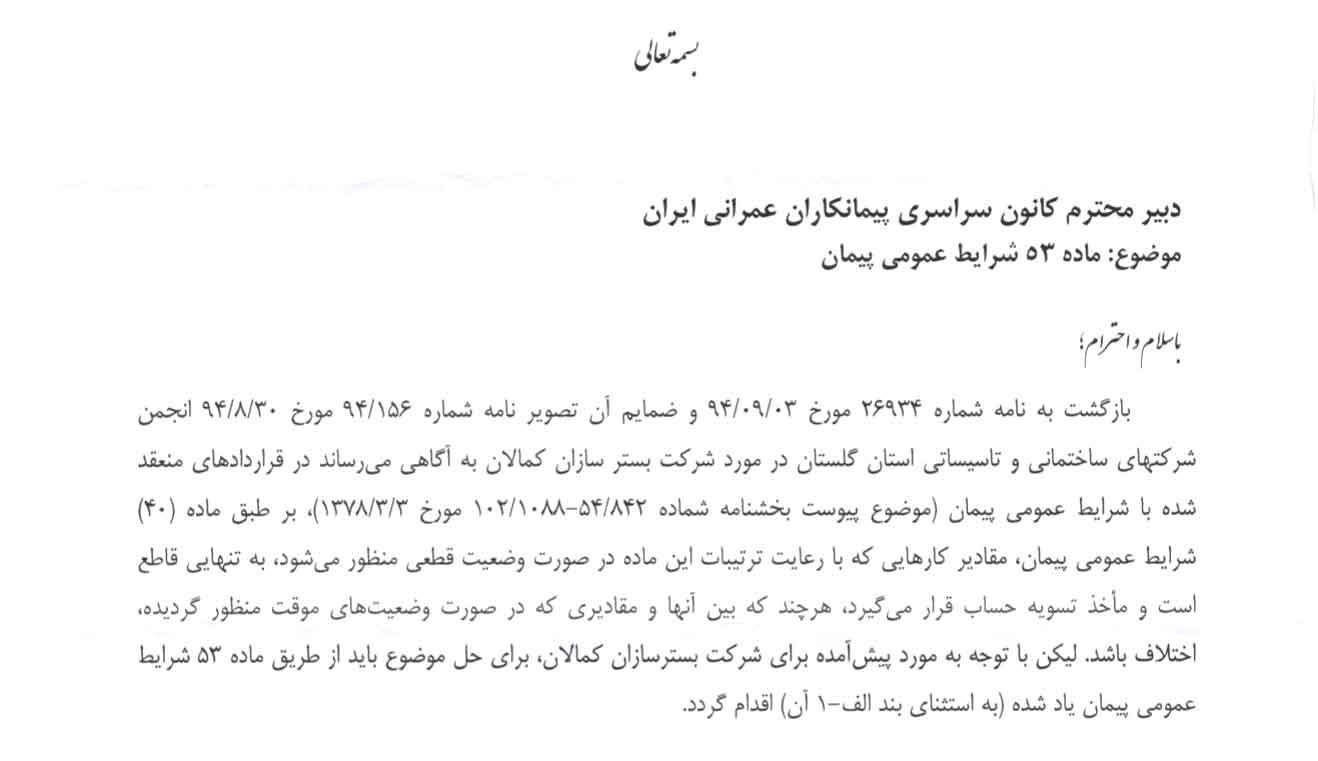 بازگشت به نامه شماره ۲۶۹۳۴ مورخ 03-09-1394 و ضمایم آن تصویر نامه شماره 156-94 مورخ 30-08-1394انجمن شرکتهای ساختمانی و تاسیساتی استان گلستان در مورد شرکت بستر سازان كمالان به آگاهی میرساند در قراردادهای منعقد شده با شرایط عمومی پیمان (موضوع پیوست بخشنامه شماره 842-54-1088-102 مورخ 03-03-1378)، بر طبق ماده (۴۰) شرایط عمومی پیمان، مقادیر کارهایی که با رعایت ترتیبات این ماده در صورت وضعیت قطعی منظور می شود، به تنهایی قاطع است و مأخذ تسویه حساب قرار میگیرد، هرچند که بین آنها و مقادیری که در صورتوضعیتهای موقت منظور گردیده، اختلاف باشد. لیکن با توجه به مورد پیش آمده برای شرکت بسترسازان كمالان، برای حل موضوع باید از طریق ماده ۵۳ شرایط عمومی پیمان یاد شده (به استثنای بند الف –۱ آن) اقدام گردد.