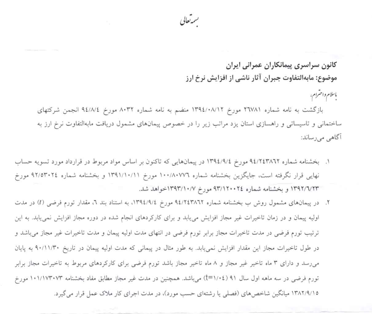 بازگشت به نامه شماره 26781 مورخ 12-08-1394 منضم به نامه شماره ۸۰۳۲ مورخ 04-08-1394 انجمن شرکتهای ساختمانی و تاسیساتی و راهسازی استان یزد مراتب زیر را در خصوص پیمانهای مشمول دریافت مابهالتفاوت نرخ ارز به آگاهی میرساند: