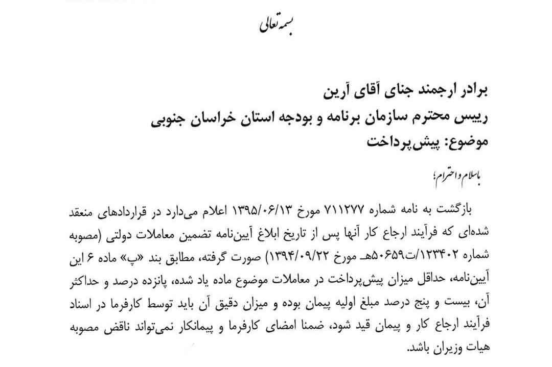 بازگشت به نامه شماره 711277 مورخ 13-06-1395 اعلام میدارد در قراردادهای منعقد شدهای که فرآیند ارجاع کار آنها پس از تاریخ ابلاغ آییننامه تضمین معاملات دولتی (مصوبه شماره 123402-ت50659ﻫـ مورخ 22-09-1394) صورت گرفته، مطابق بند «پ» ماده 6 این آییننامه، حداقل میزان پیشپرداخت در معاملات موضوع ماده یاد شده، پانزده درصد و حداکثر آن، بیست و پنج درصد مبلغ اولیه پیمان بوده و میزان دقیق آن باید توسط کارفرما در اسناد فرآیند ارجاع کار و پیمان قید شود، ضمنا امضای کارفرما و پیمانکار نمیتواند ناقض مصوبه هیات وزیران باشد.