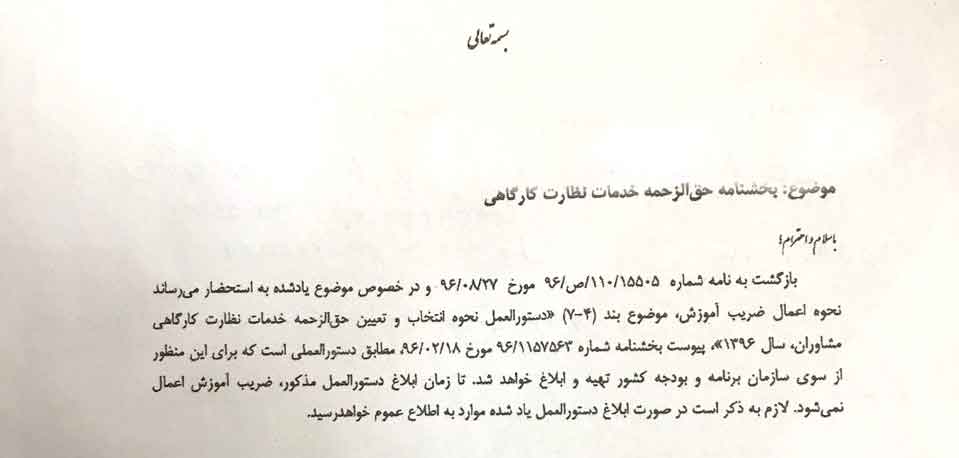 موضوع: بخشنامه حق الزحمه خدمات نظارت کارگاهی