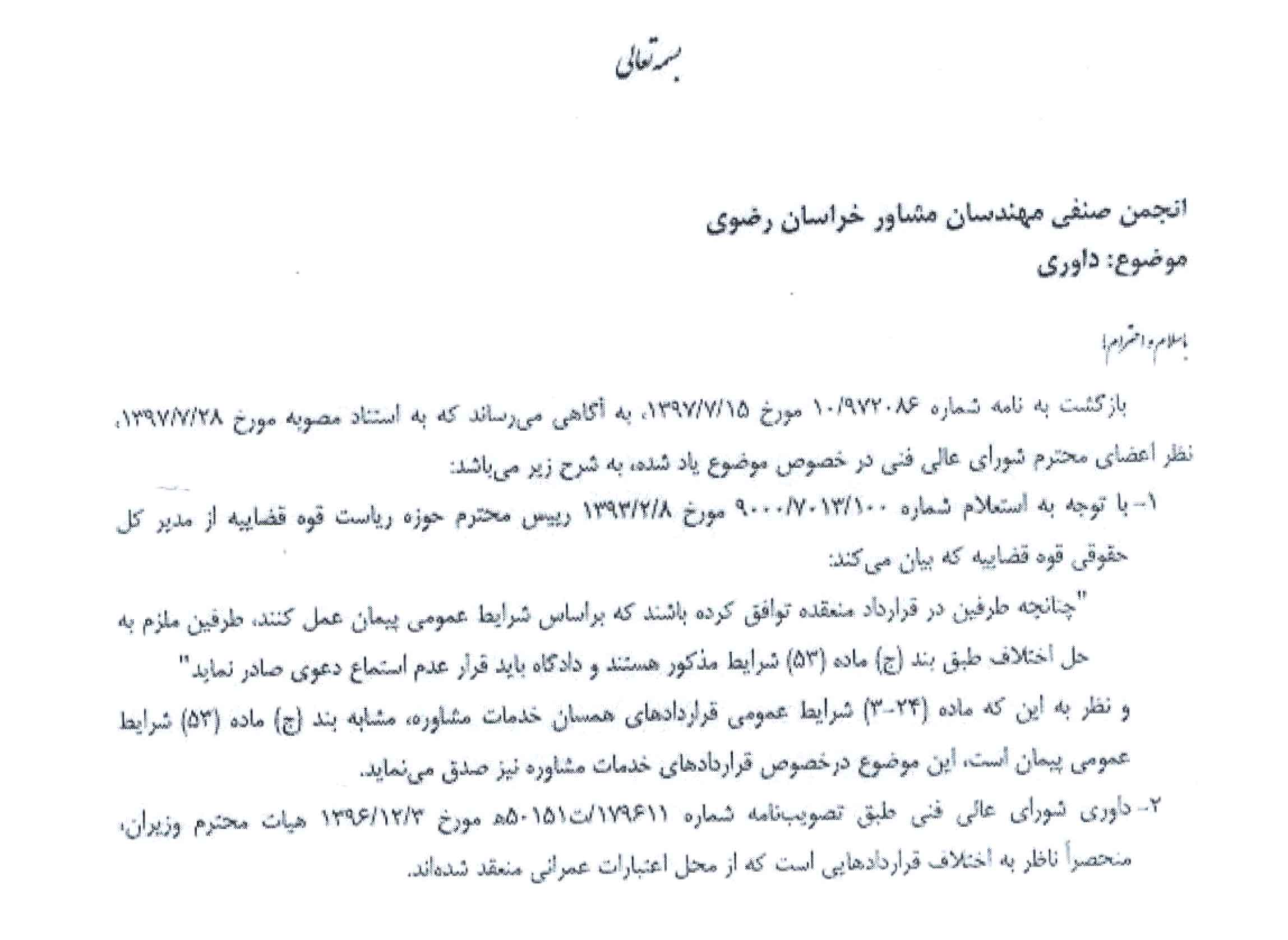 “چنانچه طرفین در قرارداد منعقده توافق کرده باشند که بر اساس شرايط عمومی پیمان عمل کنند، طرفین ملزم به حلّ اختلاف طبق «بند ج» ذیل «مادّه 53» شرایط مذكور هستند و دادگاه باید قرار عدم استماع دعوی صادر نماید”