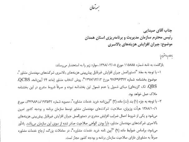 1-با توجه به مفاد “دستورالعمل جبران افزایش غیر قابل پیش بینی هزینههای بالاسری شرکتهای مهندسان مشاور ” موضوع بخشنامه شماره ۹۷-۶۹۶3۲۷ مورخ 13-۱۲-1397، روش انتخاب مشاور (ماده ۲۴ آیین نامه QCBS ،QBS تک، گزینه ای) مینای شمول یا عدم شمول این بخشنامه نبوده و صرفأ شروط مندرج در این بخشنامه ملاک عمل خواهد بود.