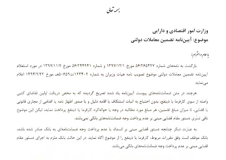 بازگشت به نامههای شماره 265427-56 مورخ 01-12-1397 و شماره 244941-56 مورخ 07-11-1397 در مورد استعلام آییننامه تضمین معاملات دولتی موضوع تصویب نامه هیات وزیران به شماره ۱۲۳۴۰۲-ت ۵۰۶۵۹ه مورخ 22-09-1394 اعلام مینماید.