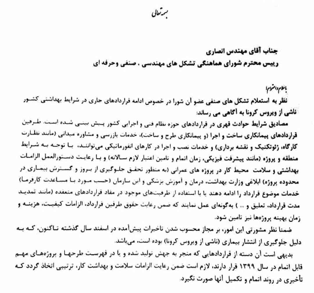 نظر به استعلام تشکل های صنفی عضو آن شورا در خصوص ادامه قراردادهای جاری در شرایط بهداشتی کشور ناشی از ویروس کرونا به آگاهی میرساند؛