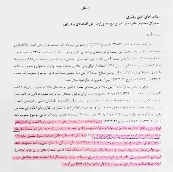 از طرفی بر اساس بند (ر) ماده 3 آییننامه اجرایی بندهای تبصره ۵ قانون بودجه سال 1398 و تکرار آن در بند ۱۱ ماده 3 همان آییننامه در سال 1399 اشاره دارد که در صورت انتشار اوراق موضوع بندهای (ب) و (ف) تبصره ۵ قانون در قالب اسناد خزانه اسلامی، استاد منتشره با حفظ قدرت خرید به صورت روزشمار، قابل واگذاری به طلبکاران قطعی و قراردادی (اعم از پيش پرداخت تعهد شده طبق قراردادهای منعقده) میشود و تمامی شرایط آن اعم از انتشار و واگذاری تابع احكام این ماده ميباشند، لذا با توجه به مواد قانونی ذکر شده و تعریف تضمین در ماده ۲ این نامه تضمین معاملات دولتی موضوع تصویب نامه اشعاره 122402\ت 50659 ه مورخ 23-09-1394، برای ناديه أصل پیش پرداخت تعهد شده در قرارداد با اقساط آن که از محل اوراق مالی اسلامی با شرایط مندرج در ضوابط و مقررات مربوطه (دارای حفظ قدرت خرید با توجه به زمان سررسید و…)، مبلغ ضمانت نامه با احساب حفظ قدرت خرید تامین میگردد. لذا در صورتی که پیمان مطابق ضوابط مربوط مشمول ماده(۲۶) شرایط عمومی پیمان فسخ شود، در اجرای مفاد بند (ب) ماده (۴۷)، در زمان رسیدگی به مبالغ پیش پرداخت مستهلک نشده طبق قوانین ومقررات مربوط، استرداد و یا ضبط رقم پیش پرداخت مستهلک نشده (تامین شده از محل اوراق خزانه اسلامی)، این مبلع با احتساب میزان حفظ قدرت خرید متناسب با میزان مستهلك نشده نزد پیمانکار (با احتساب مدت حدفاصل تاریخ اعلام ضبط ضمانت نامه تا زمان سررسید و…)، به عنوان بدهی پیمانکار لحاظ میگردد.