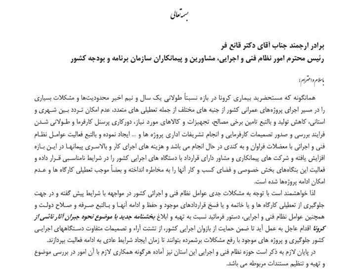 لذا خواهشمند است با توجه به مشکلات جدی عوامل نظام فنی و اجرائی کشور در مواجهه با شرایط پیش گفته و در جهت جلوگیری از تعطیلی کارگاهها و یا خاتمه و یا فسخ قراردادهای موجود و حفظ و ادامه آنها و بالتبع صرفه و صلاح دولت و همچنین عوامل نظام فنی و اجرایی، دستور فرمائید نسبت به تهیه و ابلاغ بخشنامه جدید با موضوع نحوه جبران آثار ناشی از کرونا اقدام عاجل به عمل آید تا ضمن حمایت از بازوان اجرایی کشور، از تشتت آراء و تصمیمات متفاوت دستگاههای اجرایی کشور جلوگیری و پروژههای موجود با رفع مشکلات برشمرده بتوانند تا زمان ایجاد شرایط عادی به ادامه فعالیت بپردازند.