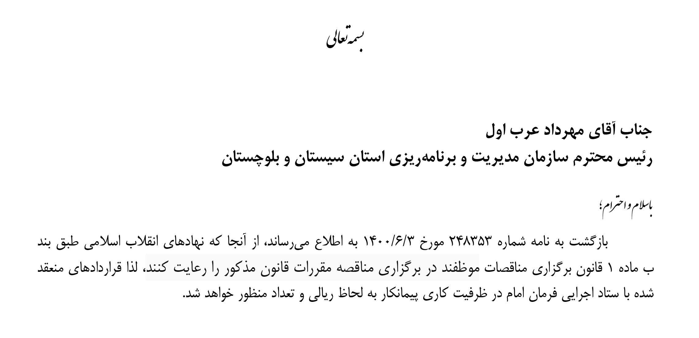 بازگشت به نامه شماره ۲۴۸۳۵۳ مورخ ۰۳-۰۶-۱۴۰۰ به اطلاع می‌رساند، از آنجا که نهادهای انقلاب اسلامی طبق بند ب ماده ۱ قانون برگزاری مناقصات موظفند در برگزاری مناقصه مقررات قانون مذکور را رعایت کنند، لذا قراردادهای منعقد شده با ستاد اجرایی فرمان امام در ظرفیت کاری پیمانکار به لحاظ ریالی و تعداد منظور خواهد شد.
