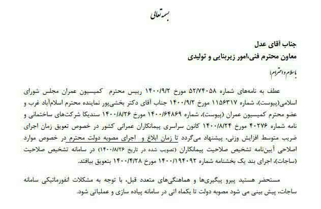 عطف به نامه های شماره ۷۴۰۵۸-۵۲ مورخ ۰۲-۰۹-۱۴۰۰ رییس محترم کمیسیون عمران مجلس شورای اسلامی (پیوست)، شماره ۱۱۵۶۳۱۷ مورخ ۰۲-۰۹-۱۴۰۰ جناب آقای دکتر بخشی پور نماینده محترم اسلام آباد غرب و عضو محترم کمیسیون عمران (پیوست)، شماره ۶۴۸۶۹-۱۴۰۰ مورخ ۲۶-۰۸-۱۴۰۰ سندیکا شرکتهای ساختمانی و نامه شماره ۴۰۲۷۶ مورخ ۲۴-۰۸-۱۴۰۰ کانون سراسری پیمانکاران عمرانی کشور در خصوص تعویق زمان اجرای ضریب متوسط افزایش وزنی، پیشنهاد میگردد تا زمان ابلاغ و اجرای مصوبه دولت محترم در خصوص موارد اصلاحی آییننامه تشخیص صلاحیت پیمانکاران (تصویب شده در تاریخ ۲۶-۰۸-۱۴۰۰) در سامانه تشخیص صلاحیت (ساجات)، اجرای بند یک بخشنامه شماره ۱۹۴۰۹۲-۱۴۰۰ مورخ ۲۸-۰۴-۱۴۰۰ تعویق بیافتد