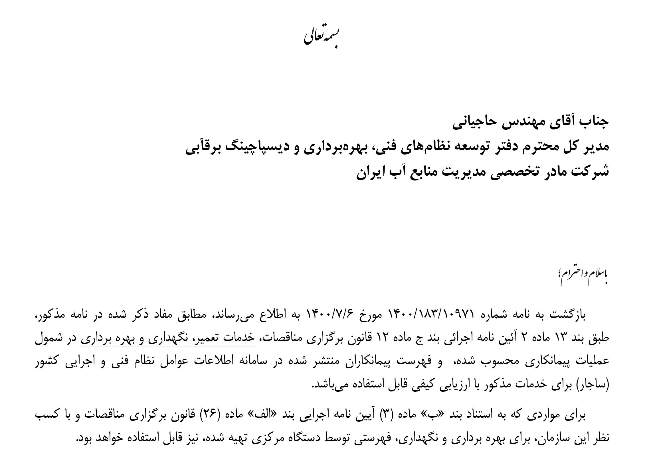 بازگشت به نامه شماره ۱۰۹۷۱-۱۸۳-۱۴۰۰ مورخ ۰۶-۰۷-۱۴۰۰ به اطلاع میرساند، مطابق مفاد ذکر شده در نامه مذکور، طبق بند ۱۳ ماده ۲ آئیننامه اجرائی بند ج ماده ۱۲ قانون برگزاری مناقصات، خدمات تعمیر، نگهداری و بهرهبرداری در شمول عملیات پیمانکاری محسوب شده، و فهرست پیمانکاران منتشر شده در سامانه اطلاعات عوامل نظام فنی و اجرایی کشور (ساجار) برای خدمات مذکور با ارزیابی کیفی قابل استفاده میباشد.