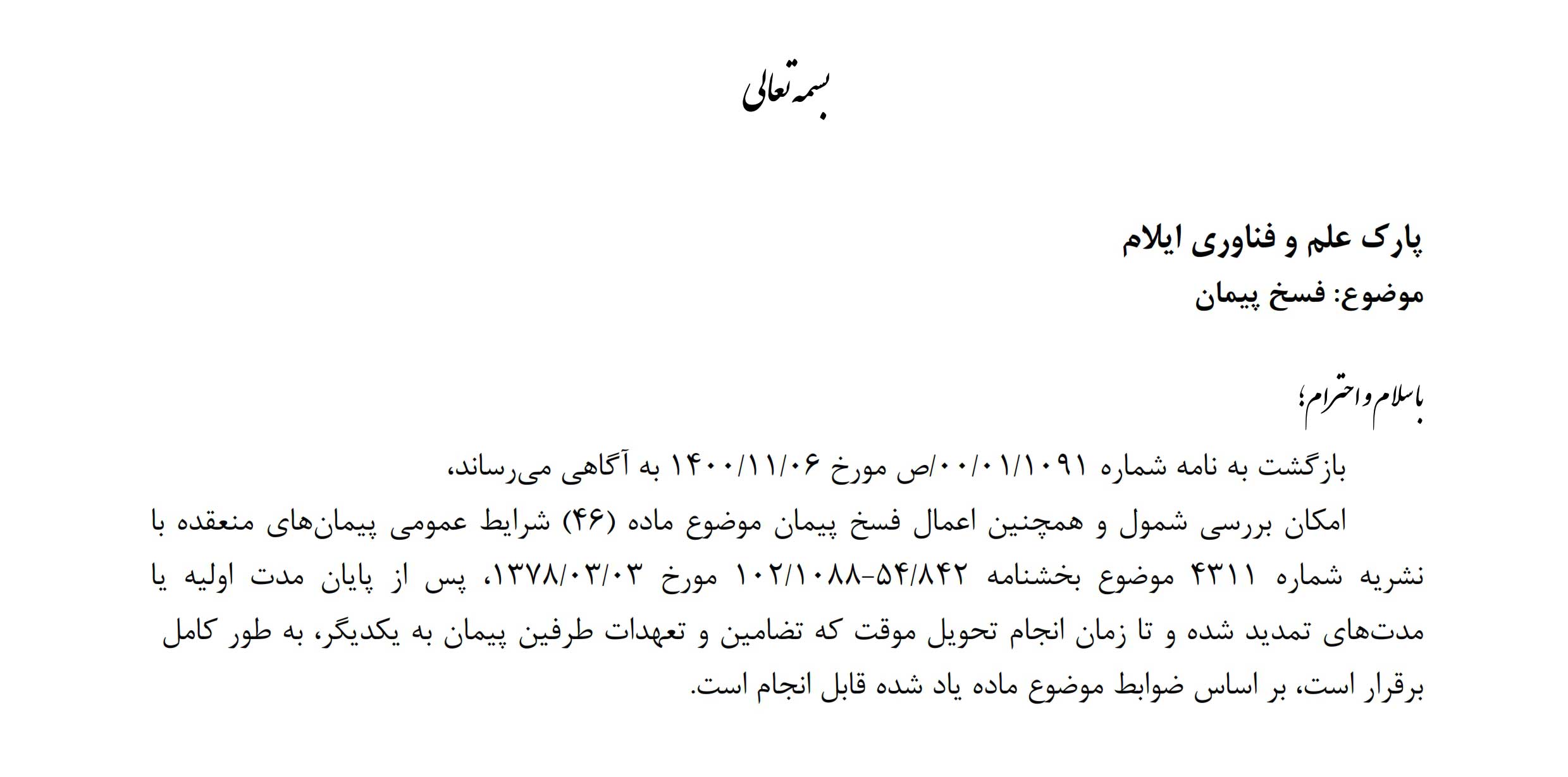 امکان بررسی شمول و همچنین اعمال فسخ پیمان موضوع ماده (۴۶) شرایط عمومی پیمانهای منعقده با نشریه شماره ۴۳۱۱ موضوع بخشنامه ۵۴/۸۴۲-۱۰۲/۱۰۸۸ مورخ ۱۳۷۸/۰۳/۰۳ پس از پایان مدت اولیه یا مدتهای تمدید شده و تا زمان انجام تحویل موقت که تضامین و تعهدات طرفین پیمان به یکدیگر، به طور کامل برقرار است بر اساس ضوابط موضوع ماده یاد شده قابل انجام است.