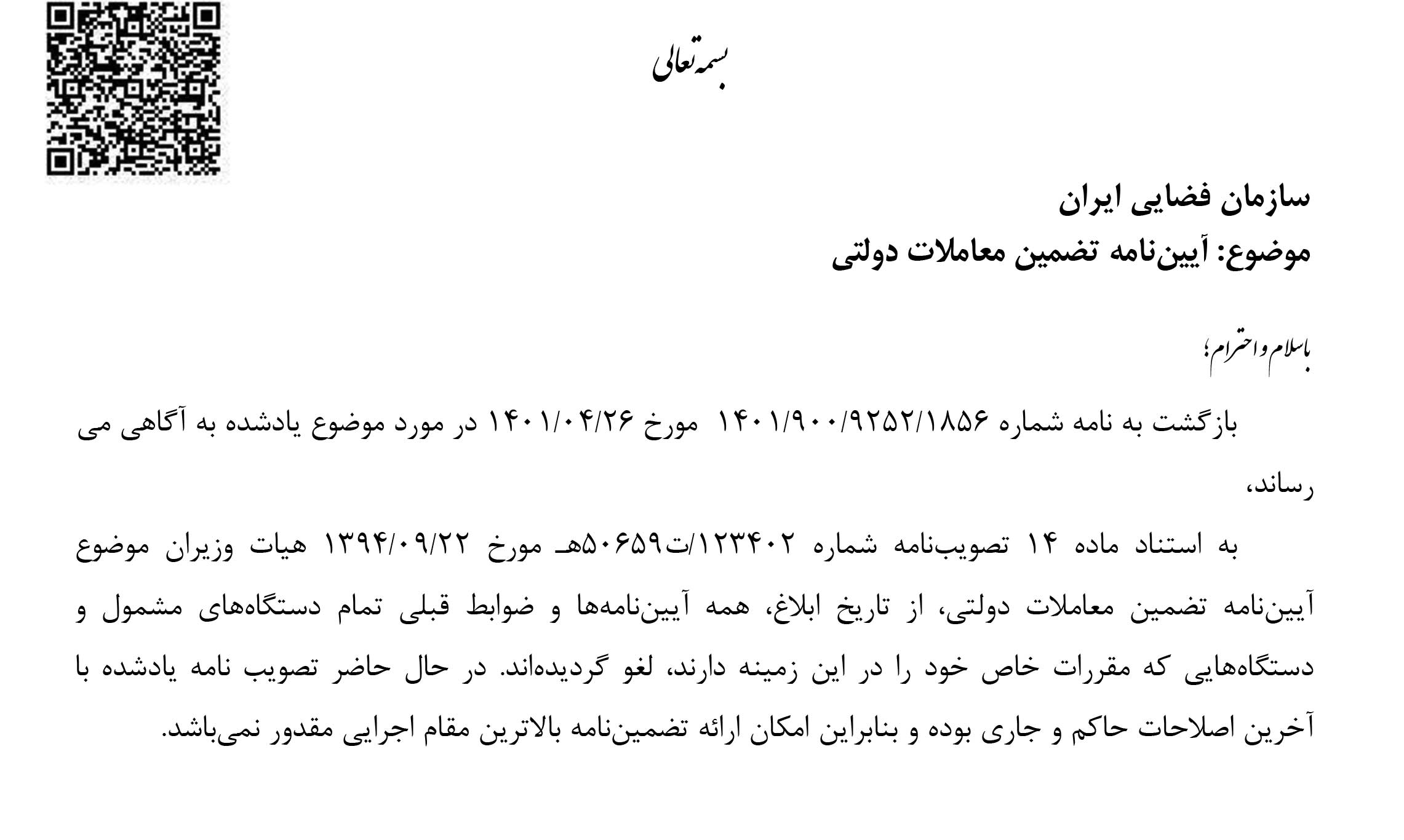 بازگشت به نامه شماره ۱۴۰۱/۹۰۰/۹۲۵۲/۱۸۵۶ مورخ ۱۴۰۱/۰۴/۲۶ در مورد موضوع یادشده به آگاهی می‌رساند، به استناد ماده ۱۴ تصویب نامه شماره ۱۲۳۴۰۲/ت ۵۰۶۵۹هـ مورخ ۱۳۹۴/۰۹/۲۲ هیات وزیران موضوع آیین نامه تضمین معاملات دولتی، از تاریخ ابلاغ، همه آیین نامه‌ها و ضوابط قبلی تمام دستگاه‌های مشمول و دستگاه‌هایی که مقررات خاص خود را در این زمینه دارند، لغو گردیده‌اند. در حال حاضر تصویب نامه یادشده با آخرین اصلاحات حاکم و جاری بوده و بنابراین امکان ارائه تضمین نامه بالاترین مقام اجرایی مقدور نمی‌باشد.