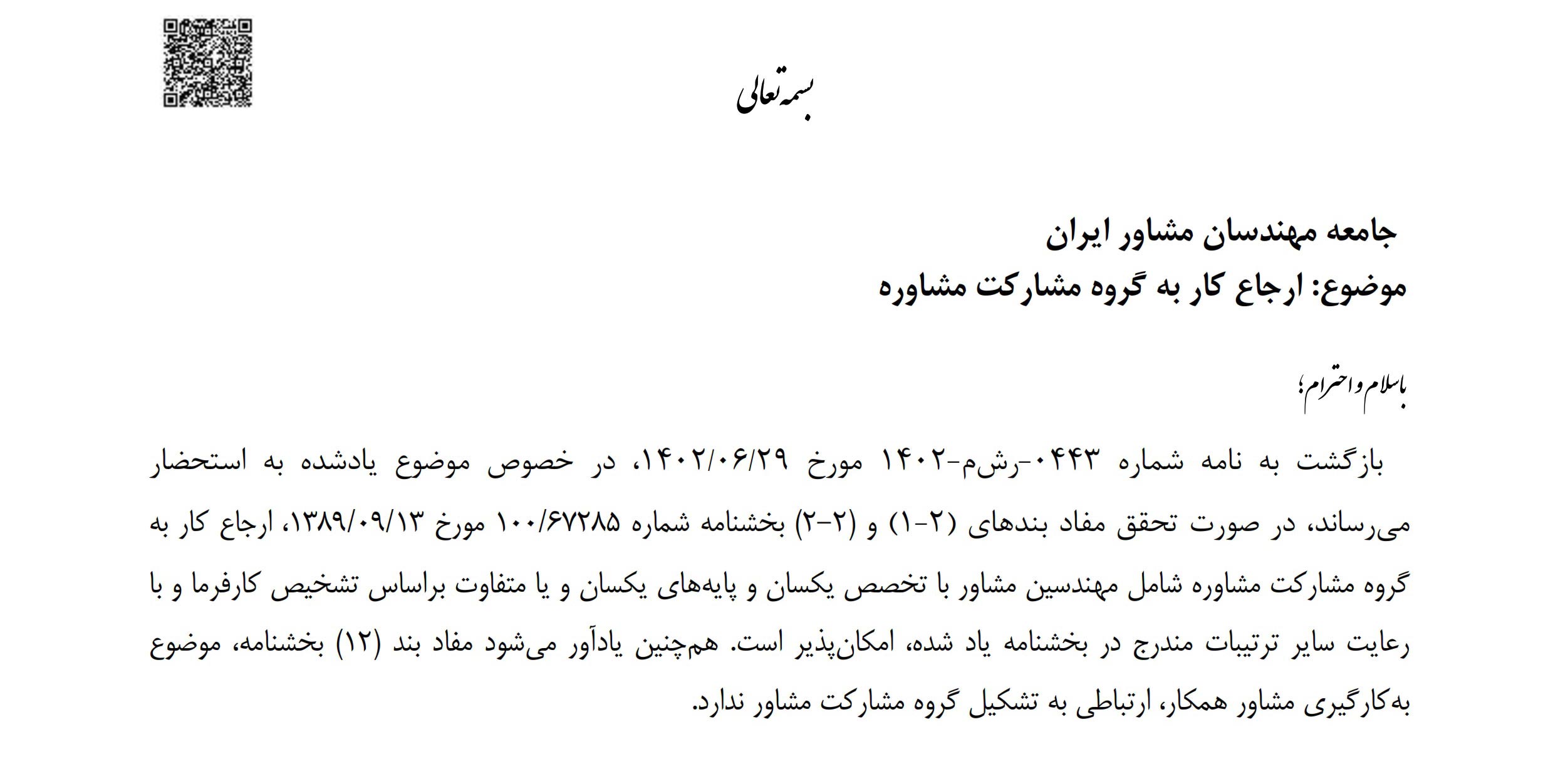 بازگشت به نامه شماره ۰۴۴۳-رشم-۱۴۰۲ مورخ ۱۴۰۲/۰۶/۲۹، در خصوص موضوع یادشده به استحضار میرساند، در صورت تحقق مفاد بندهای (۲-۱) و (۲-۲) بخشنامه شماره ۱۰۰/۶۷۲۸۵ مورخ ۱۳۸۹/۰۹/۱۳، ارجاع کار به گروه مشارکت مشاوره شامل مهندسین مشاور با تخصص یکسان و پایههای یکسان و یا متفاوت براساس تشخیص کارفرما و با رعایت سایر ترتیبات مندرج در بخشنامه یاد شده، امکان پذیر است. همچنین یادآور میشود مفاد بند (۱۲) بخشنامه، موضوع بهکارگیری مشاور همکار، ارتباطی به تشکیل گروه مشارکت مشاور ندارد.