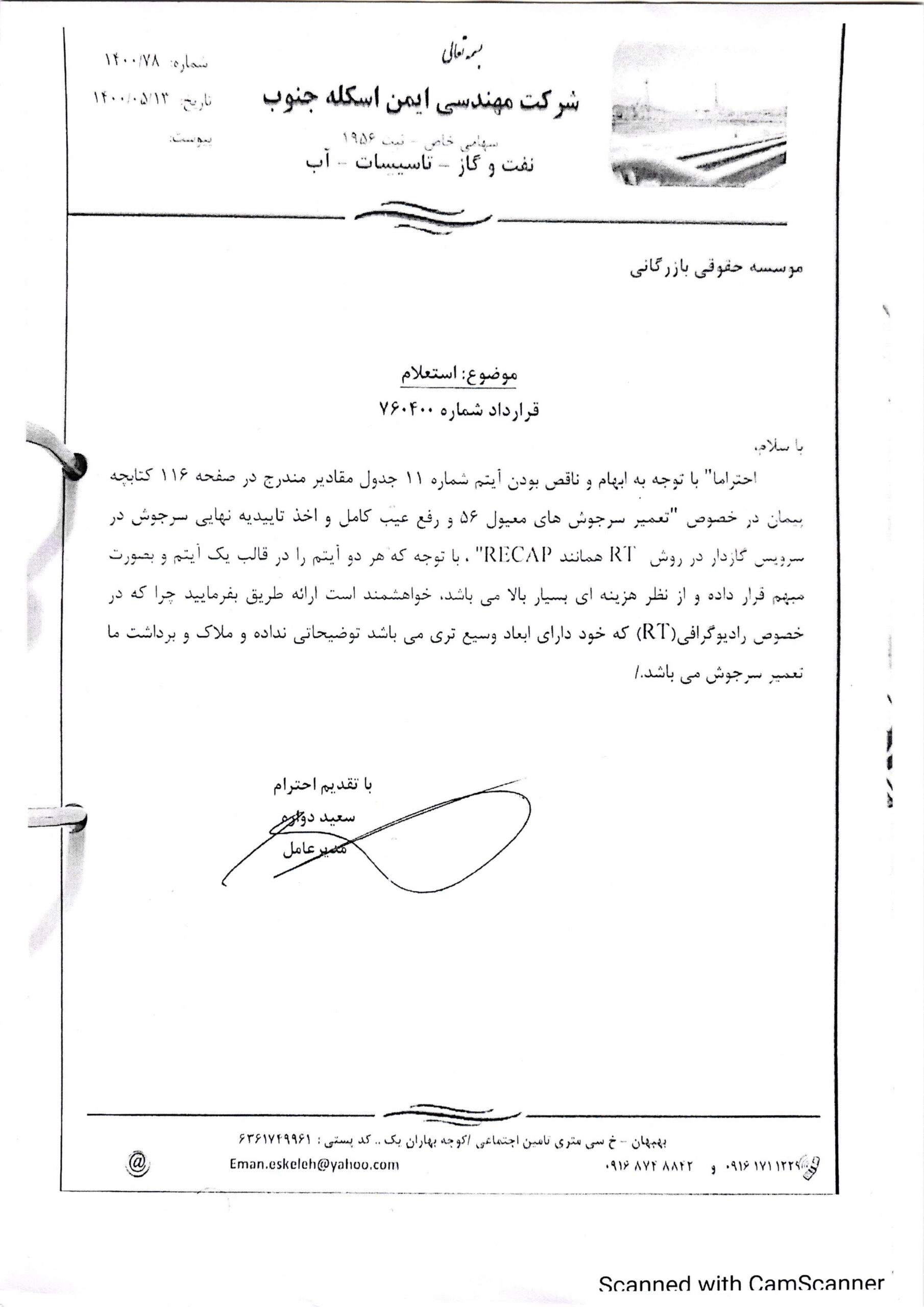 احتراماً با توجه به ابهام و ناقص بودن آیتم شماره ۱۱ جدول مقادیر مندرج در صفحه ۱۱۶ کتابچه پیمان در خصوص “تعمیر سرجوش‌های معیول ۵۶ و رفع عیب کامل و اخذ تاییدیه نهایی سرجوش در سرویس گازدار در روش RT همانند RECAP”، با توجه که هر دو آیتم را در قالب یک آیتم و بصورت مبهم قرار داده و از نظر هزینه‌ای بسیار بالا می‌باشد، خواهشمند است ارائه طریق بفرمایید چرا که در خصوص رادیوگرافی (RT) که خود دارای ابعاد وسیع تری میباشد توضیحاتی نداده و ملاک و برداشت ما تعمیر سرجوش می‌باشد.