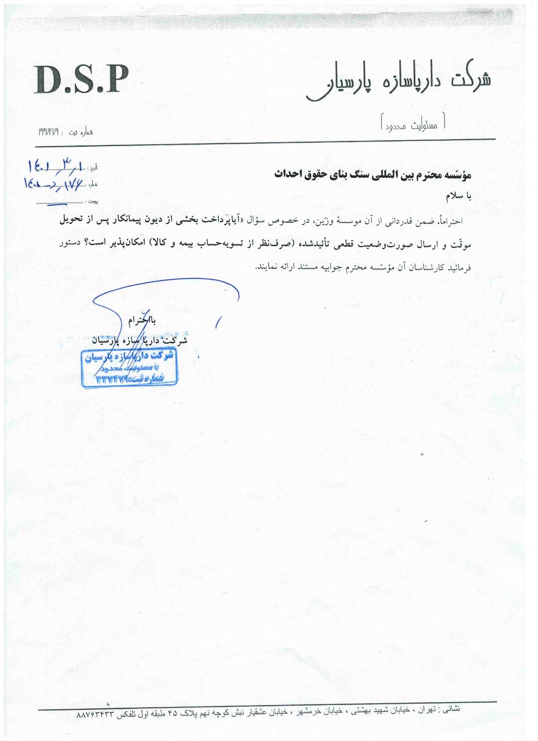 احتراما، ضمن قدردانی از آن موسسه وزین، در خصوص سؤال «آیا پرداخت بخشی از دیون پیمانکار پس از تحویل موقت و ارسال صورت وضعیت قطعی تأئیدشده (صرف نظر از تسویه حساب بیمه و کالا) امکان پذیر است؟ دستور فرمائید کارشناسان آن مؤسسه محترم جوابیه مستند ارائه نمایند.